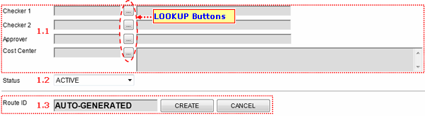 NEW Button: Clik this button to create new Approval Route. Required informations for Creating new Approval Route: Creating a new Approval Route: 2.1 Checker 1: Click the lookup button to view and select information. lookup for Checker 1: