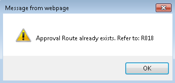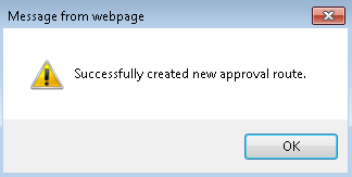 2.2 STATUS: Use the dropdown control to select a status either ACTIVE or INACTIVE 2.3 CREATE Button: Click this button once you have already fill out all required informations to create a new Approval Route. This message from WEB prompts when you have successfully created a new Approval Route Master. Click OK to continue: This message from WEB prompts when Approval Route was not created successfully. You may check your entry and try saving it again later. Click OK to continue: CANCEL button: Click this button if you wish not to continue with this transaction. |